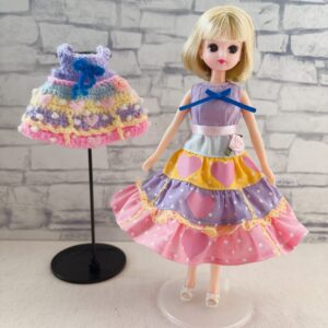 なので、ちょっとしたお遊びのつもりで、あみぐるみに作ったドレス(毛糸)と同じデザインでリカちゃんサイズのドレス(布)を作ってみました。