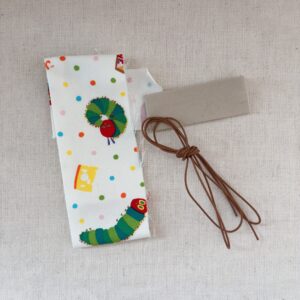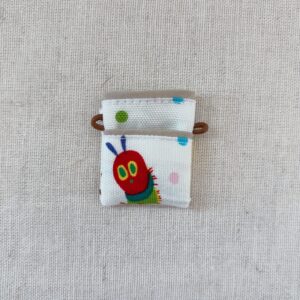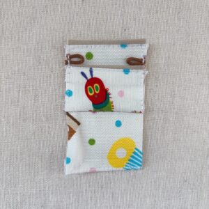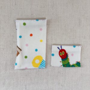 同じ布地をネットで探したけど見つけられず・・・あおむしくんのイラストと写っていない文字の部分はこの布地(↓)が近いけど・・・背景はドット模様にフルーツやチーズ、ケーキなんかの食べ物がランダムに飛んでるんですよねぇ。