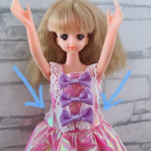 リボンは、本体と同じく『オーロララメのコーティングをした布』の白を使うようですが、同じ布地の白は入手できなかったので、家にあった紫色のリボンパーツを縫い付けることにしました。