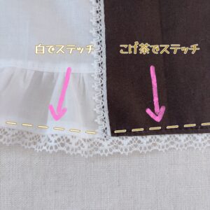 裾のレースを付けた後にステッチを入れるところ、手順では端から端まで1回で入れてしまっていますが、私のように濃い色味の布地と薄い色味の布地の組み合わせだと・・・濃い色の糸では白い布地のところで糸が目立つし、薄い色の糸では濃い色の布地のところで糸が目立ってしまいます。