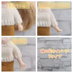 タカラトミーさんのお人形と、オビツ11・ねんどろいどどーるでは腕の長さが異なるので、袖の長さは2パターンを用意しました。