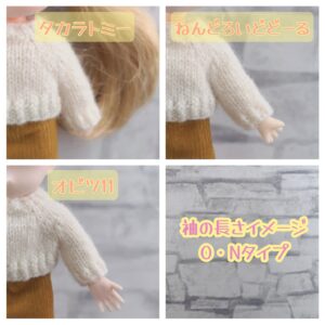 タカラトミーさんのお人形にぴったり、オビツ11・ねんどろいどどーるでは7分袖くらいの長さになります。