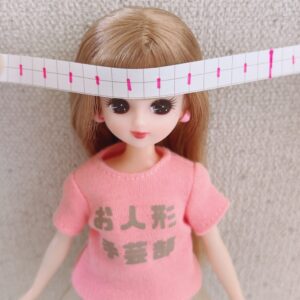 帽子の大きさの目安を知るため、リカちゃんの頭のサイズを測ります。